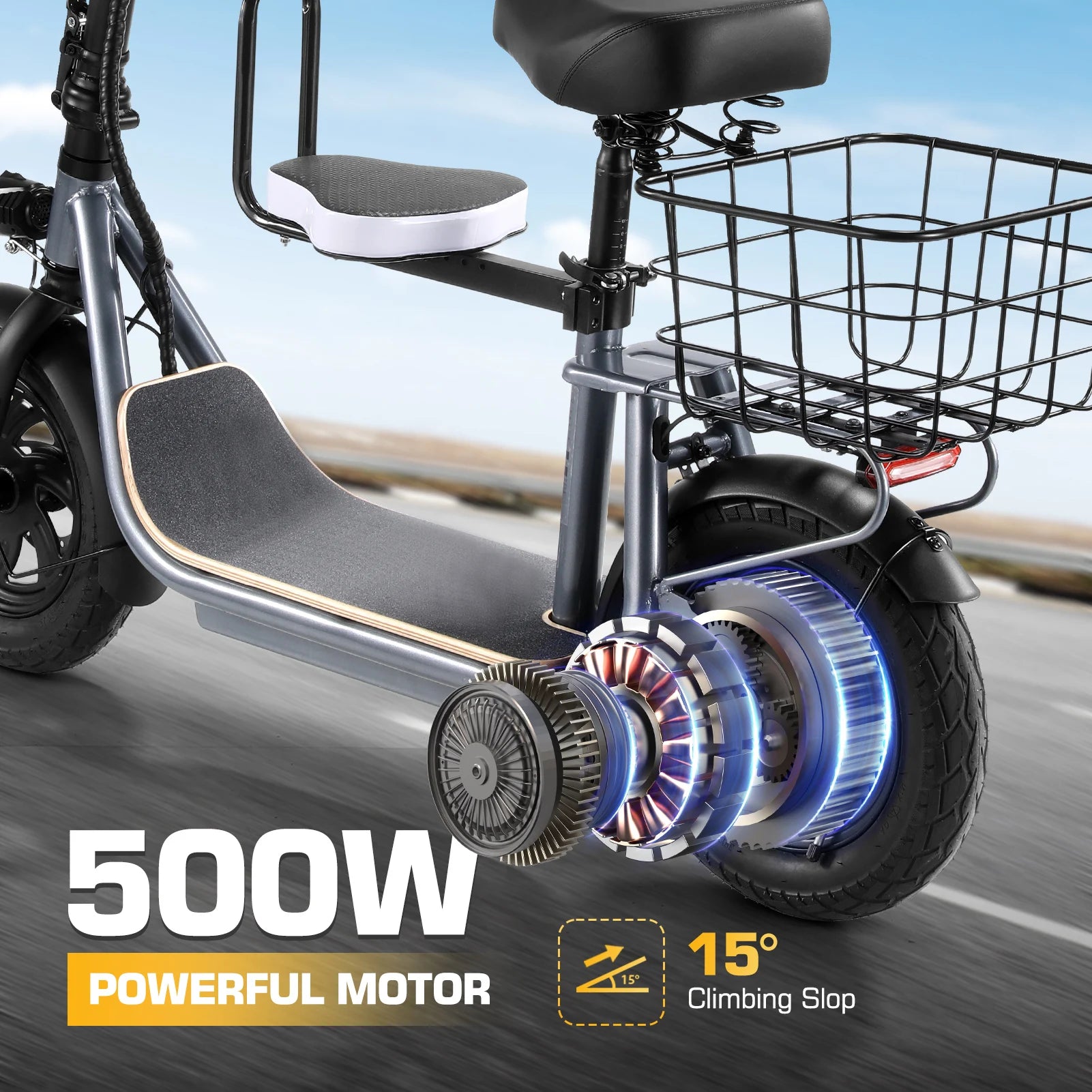 Meet the CAROMA Folding Electric Scooter With Seat For Commuting—your compact, seat-equipped solution for fast, comfortable urban travel.