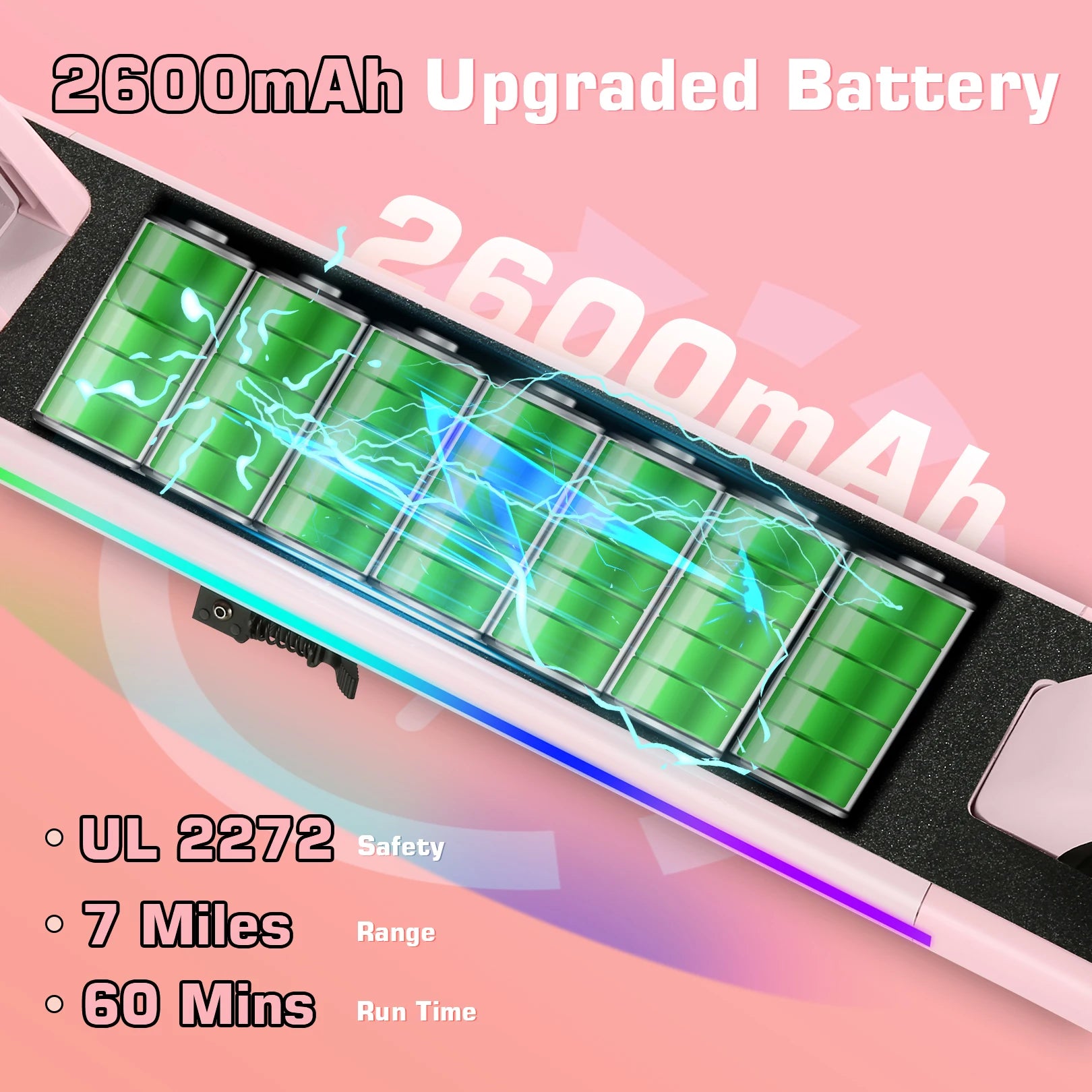 - Glow deck & light bar: rainbow lights add visibility and style for nighttime rides.