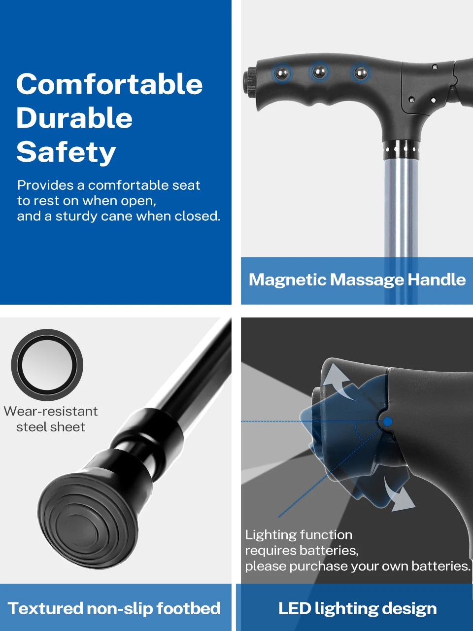 - Comfortable seat and sturdy support: Open the cane to enjoy a comfortable built-in seat, or close it for a reliable walking cane when you’re on the move.